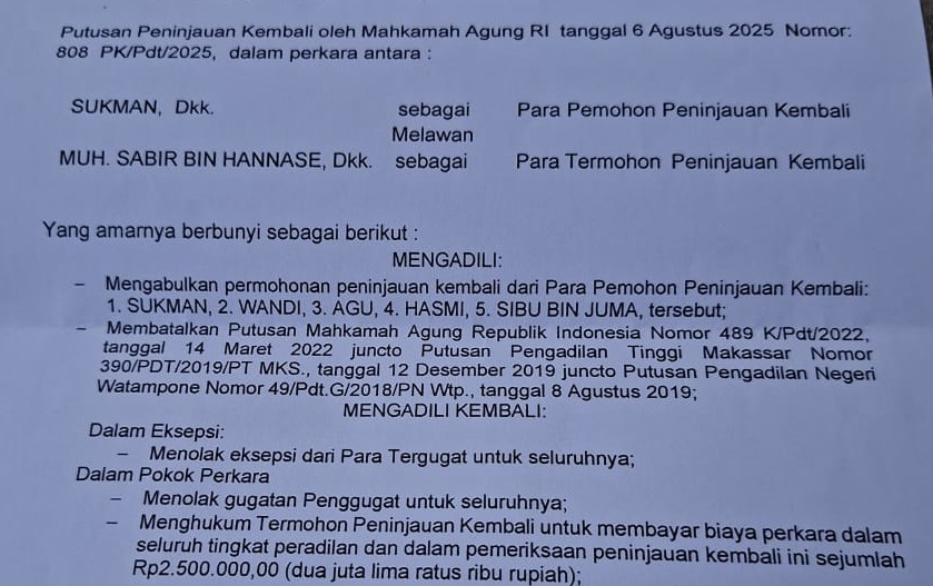 “Kami sangat berterimakasih kepada Mahkamah Agung, pihak Pengadilan Negeri Makassar dan Pengadilan Negeri Watampone, sampai saat ini kebenaran masih ditegakkan lurus kepada rakyat kecil seperti kami,” kata Sibu Bin Juma, kamis (25/09/2025).